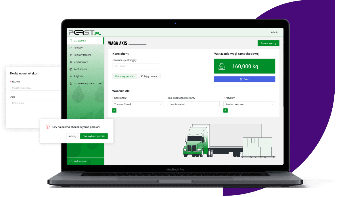 Aplikacja oferuje szeroką gamę funkcjonalności, takich jak możliwość zarządzania wagami, dokonywania pomiarów, zarządzania listą kontrahentów oraz produktów. Użytkownicy, w zależności od uprawnień (administrator lub operator), mają różnorodne możliwości działania w systemie. Perst pozwala na gromadzenie pomiarów w trybie ciągłym lub na żądanie, a także na generowanie raportów w formatach CSV lub PDF. Klient wyraził również potrzebę łączenia różnych wyników pomiarowych w celu określenia różnicy między nimi, dlatego rozszerzyliśmy narzędzie o opcję kalkulacji masy netto.